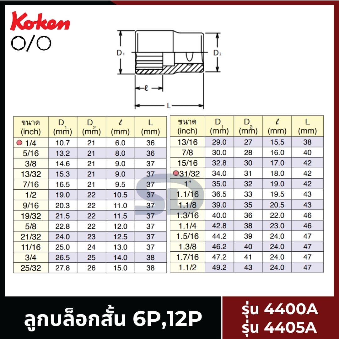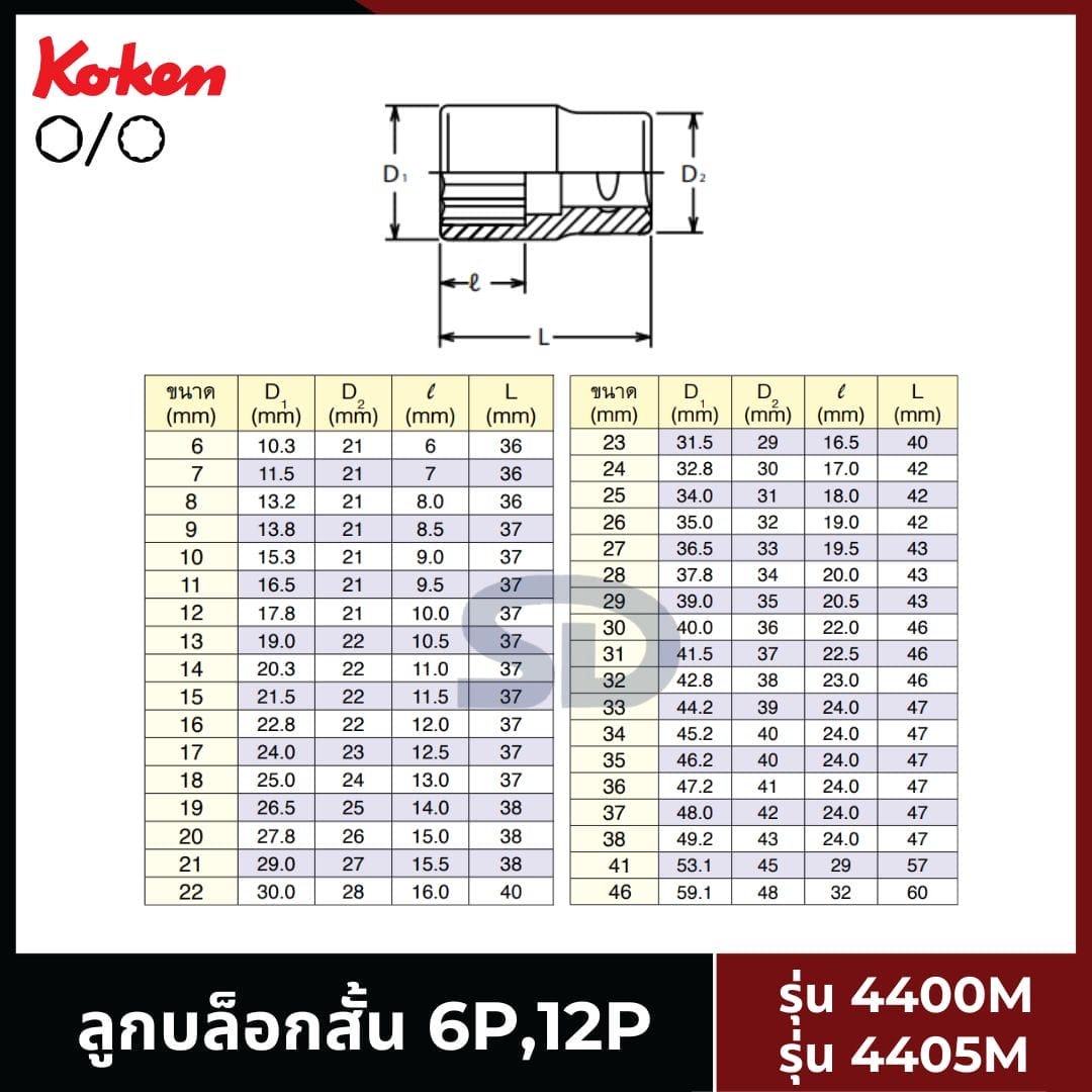 ลูกบล็อกสั้น 6เหลี่ยม หรือ 12เหลี่ยม รู 1/2” (4หุน) KOKEN รุ่น 4400